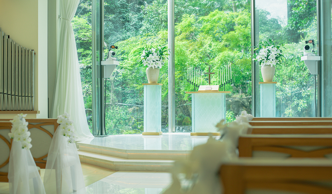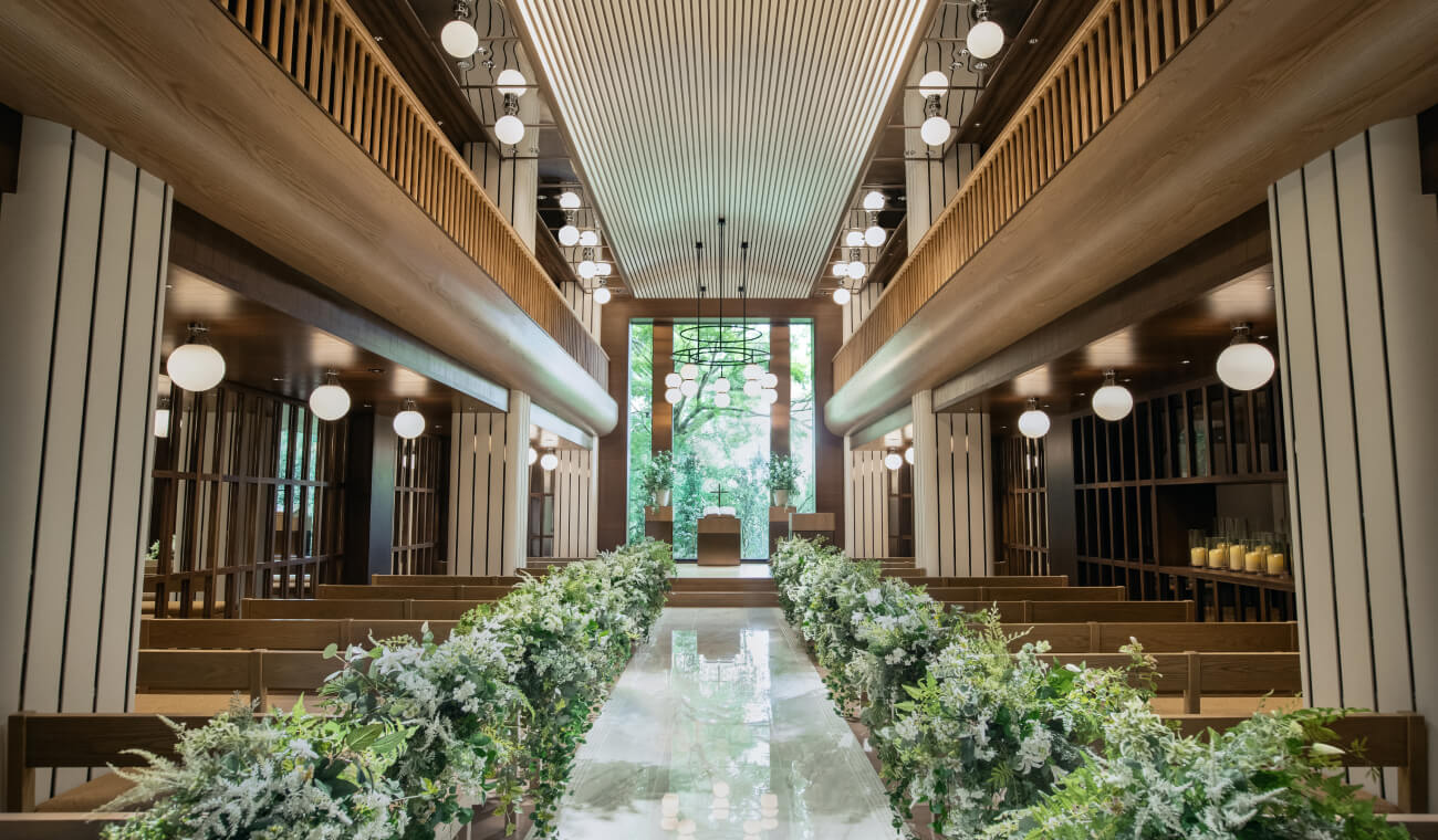 風格各異的兩座教堂,都有綠意映入眼簾。在洋溢歡欣祝福的空間裡,沉浸於笑容和溫馨氣氛中,許下永誌不渝的承諾吧。優美如畫的光景不只新人難忘,此情此景也將深深烙印在賓客腦海。