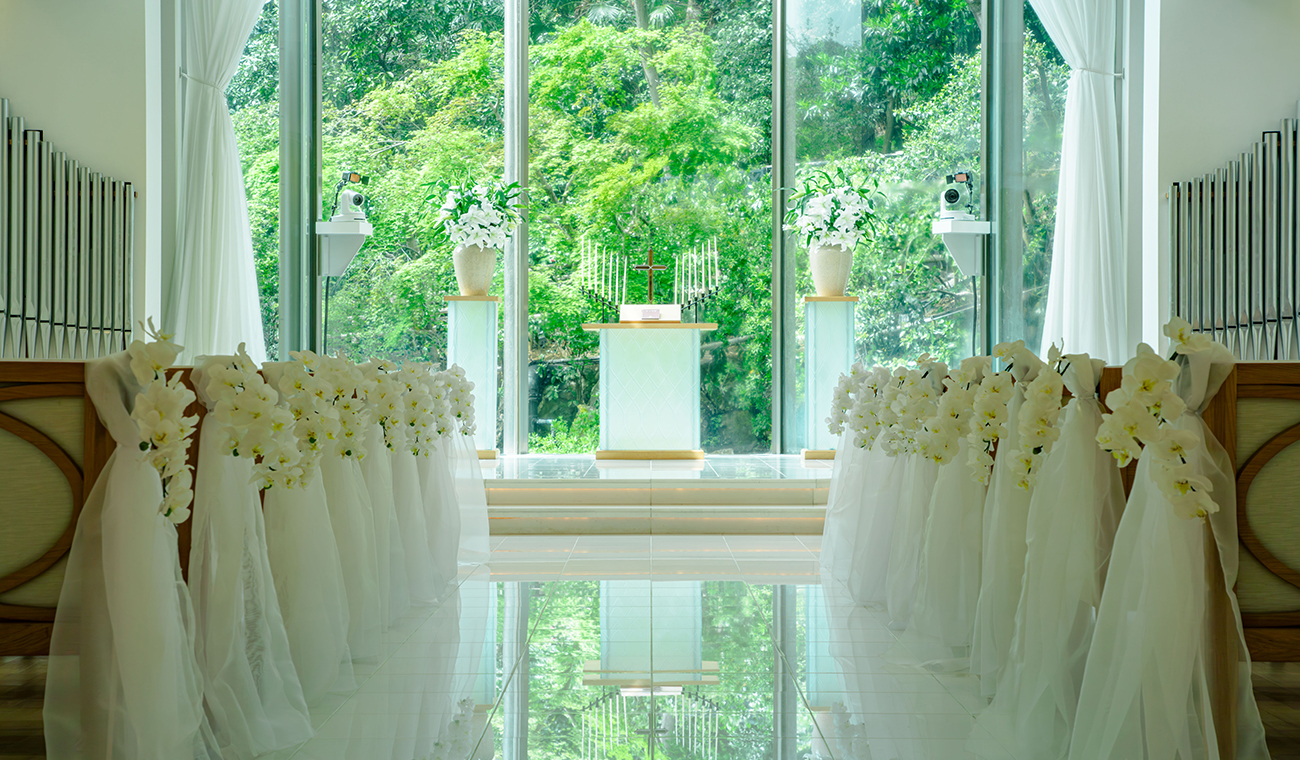 風格各異的兩座教堂,都有綠意映入眼簾。在洋溢歡欣祝福的空間裡,沉浸於笑容和溫馨氣氛中,許下永誌不渝的承諾吧。優美如畫的光景不只新人難忘,此情此景也將深深烙印在賓客腦海。